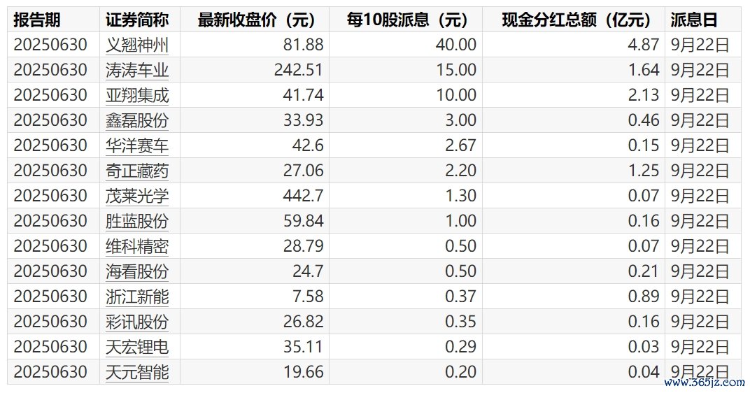 A股分成派息转增一览(9月19日):14股当天股权登记