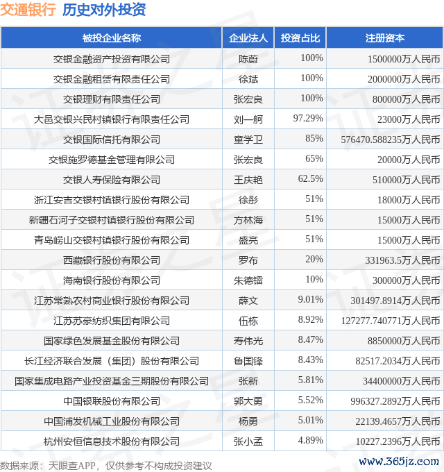 本站音问,凭证天眼查APP败露,交通银行(601328.SH)新增沿途对外投资事件,被投资公司为苏州禾盛新式材料股份有限公司,法定代表东谈主梁旭,投资占比为0.97%。该公司从事接洽机、通讯和其他电子建筑制造业,注册本钱为24811.233万东谈主民币。现在,交通银行共存在对外投资177项,投资占比前20的状貌见下表: